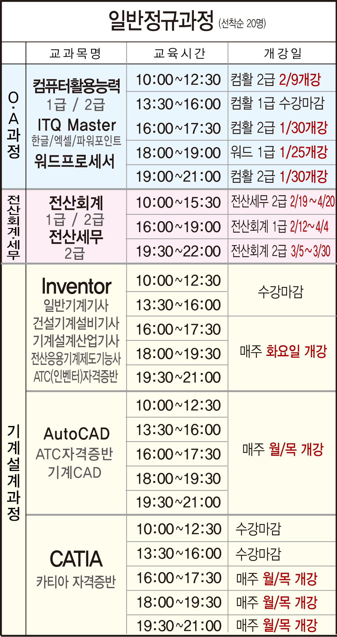 겨울방학특강 시간표(2018년 1월 2월)