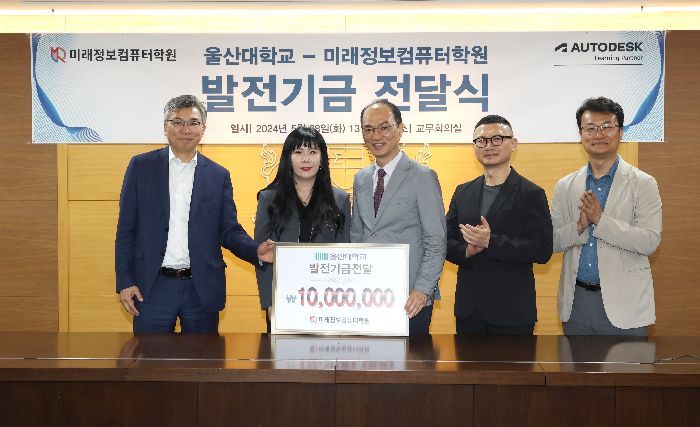 울산대는 28일 미래정보컴퓨터학원이 산업디자인학전공에 발전기금 1000만원을 전달했다고 이날 밝혔다. 이번 발전기금은 3D설계 소프트웨어 글로벌 회사인 오토데스크사 한국 Distributor인 엠듀가 울산대 산업디자인학전공 학생들에 대한 교육과 실습지원 등 전문인력 양성을 지원하기 위해 이뤄졌다.
